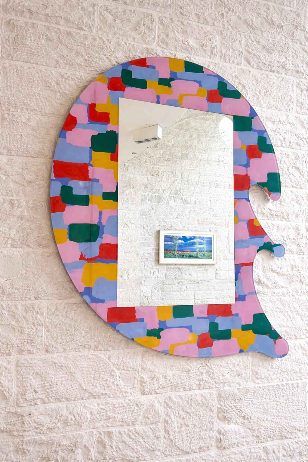 La superficie riflettente centrale, dalle linee pulite e geometriche, crea un interessante contrasto con la cornice irregolare e colorata. Questo equilibrio tra minimalismo e creatività rende lo specchio perfetto sia per ambienti moderni sia per spazi più eclettici.