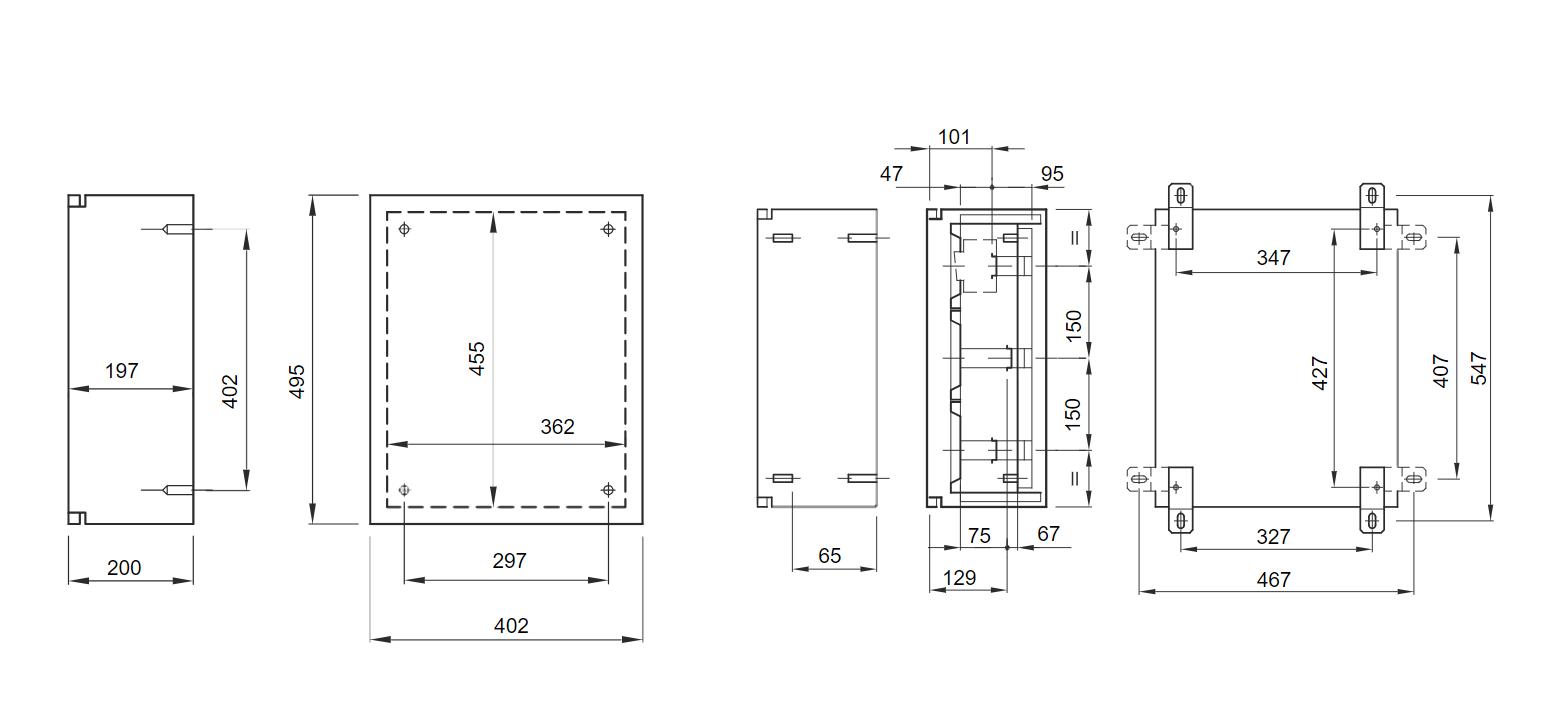 Quadro stagno in metallo con porta cieca munita di serratura. Dotato di tappi coprivite, perni filettati o squadrette reversibili con relativa viteria per il fissaggio di piastre di fondo o di montanti per apparecchiature modulari.
