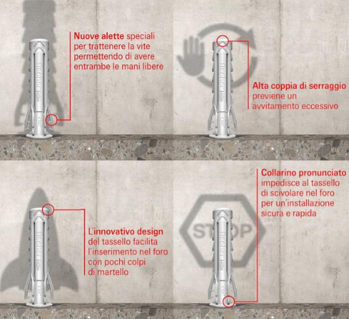 L’innovativo design del tassello facilita l’inserimento nel foro con pochi colpi di martello.