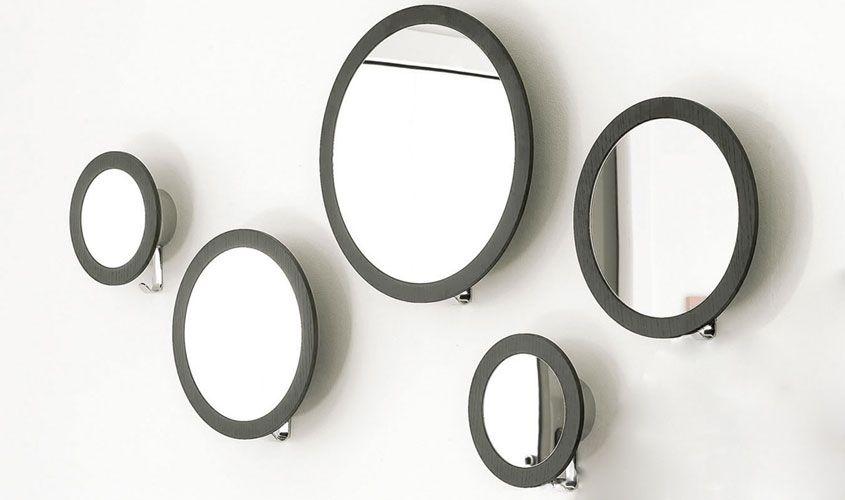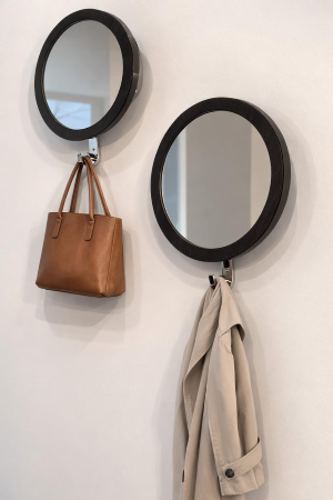 Set composto da 2 specchi rotondi con cornice color wengé e gancio appendiabiti integrato, ideale per ingressi, corridoi, camere o ambienti contract.