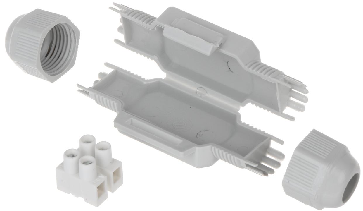 Muffola di giunzione dritta riempita di gel sigillante. Il prodotto soddisfa il grado di tenuta IP68. La scatola è perfetta da usare in zone con elevata umidità e sotto la terra (ad esempio, in impianti elettrici del giardino).