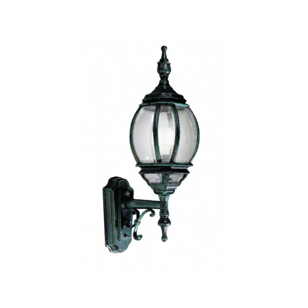 Il prodotto raffigurato rappresenta una soluzione illuminotecnica dal design storicizzato, con un corpo in alluminio pressofuso rifinito in tonalità verde anticato, concepito secondo i canoni costruttivi della tradizione metalmeccanica. La struttura presenta un braccio decorativo e una lanterna a globo con vetro satinato/parzialmente opalino, garantendo una diffusione luminosa morbida e uniforme.