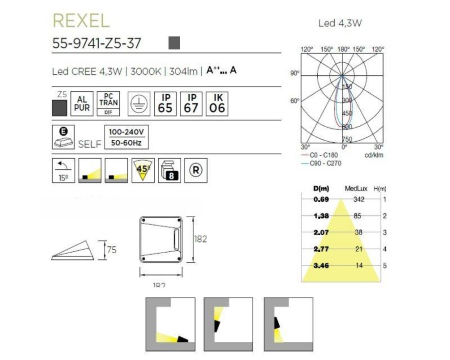 Larghezza 18,2 cm, Altezza 7,5 cm. Led CREE integrato con potenza 4,3W e alimentatore incluso. Tonalità di luce 3.000°K (Luce Calda). 281 lumen.(Flusso luminoso) oppure 4000°K ( Luce Naturale ) 281 lumen. Fascio d’apertura luce: 45°. Classe energetica A++