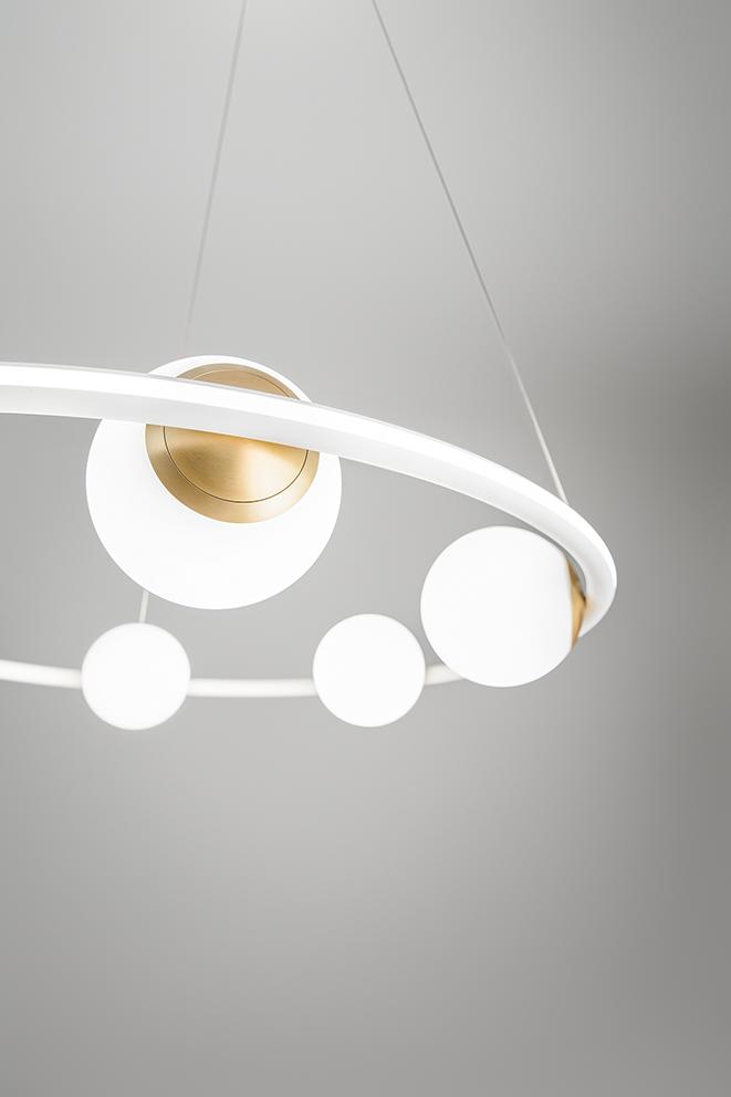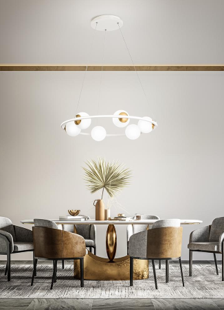 Grazie alla doppia emissione di luce, sia attraverso le sfere che mediante il diffusore in silicone, questo lampadario offre un'illuminazione sofisticata e omogenea a 360°, ideale per spazi living, sale da pranzo e salotti.