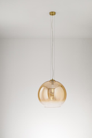 Collezione con struttura in metallo e alluminio nelle varie finiture. Diffusore in vetro soffiato con effetto sfumato a scelta nei vari colori e diametri. Cavi di supporto in acciaio e cavo alimentazione in PVC. Colore: ambra trasparente sfumato + ottone brunito D.45 x H.191 cm 1 x E27 MAX 60W 220-240V 50/60Hz IP20 - Classe I H. regolabile