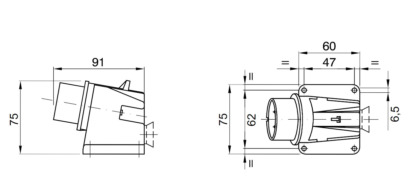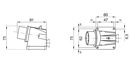 Spina industriale da 32A in versione fissa da parete a 90° con grado di protezione IP44. Cablaggio tramite morsetto a vite. Spina 2P