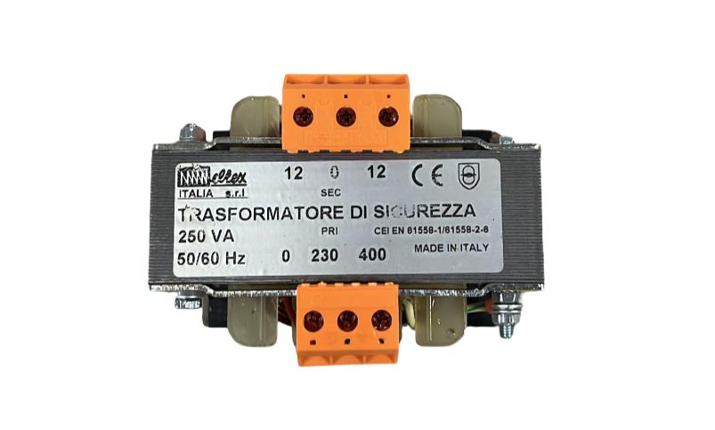 Trasformatore con tensione primaria 230/400 V, tensione secondaria 12/24 V, potenza nominale 250VA