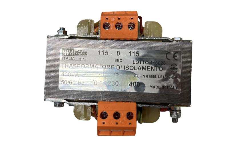 Trasformatore monofase, potenza nominale 400 VA, tensione primaria 230/400 V, tensione secondaria 110/230 V.
