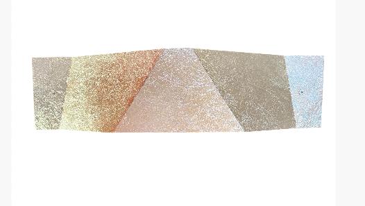 La superficie è composta da piani geometrici irregolari che si incontrano in angoli netti e superfici leggermente concave e convesse, creando un effetto tridimensionale e dinamico. La foglia argento applicata a mano dona un aspetto prezioso e cangiante, con riflessi che variano a seconda della luce incidente.
