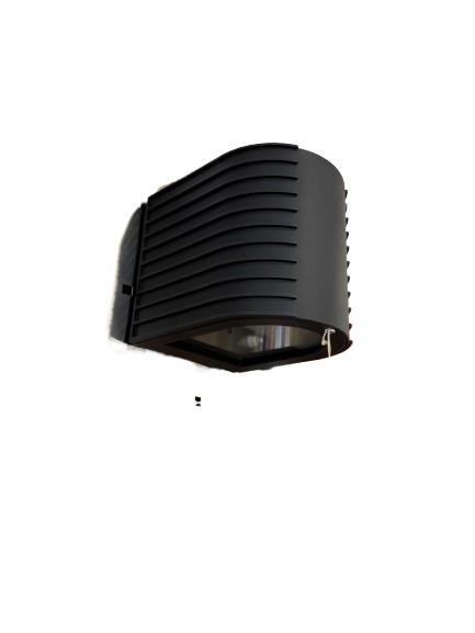 Realizzata in alluminio pressofuso verniciato a polveri con finitura antracite, si distingue per il suo design curvo con alette frontali che proteggono la fonte luminosa e creano un piacevole effetto di luce indiretta.