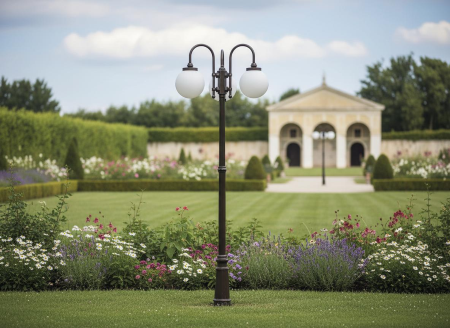 Palo artistico per illuminazione esterna realizzato in alluminio pressofuso con finitura nera, progettato secondo i canoni classici della carpenteria illuminotecnica. La struttura si articola in tre bracci armonizzati da un design tradizionale, ciascuno equipaggiato con sfera diffusore bianca Ø25 cm per una distribuzione luminosa uniforme e di forte impatto scenografico.