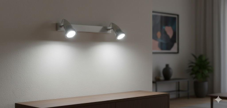 Design Moderno e Funzionale Questo apparecchio si distingue per la sua configurazione a doppia sorgente luminosa orientabile, montata su una barra orizzontale elegante. La struttura lineare e minimalista si adatta perfettamente a contesti moderni, garantendo al contempo massima praticità d'uso.
