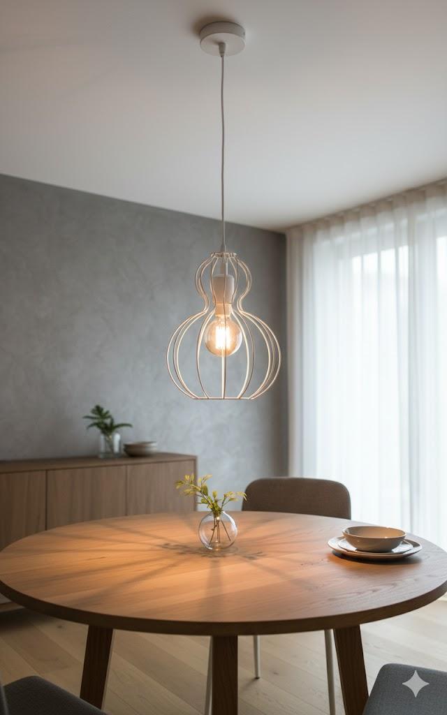 La geometria aperta valorizza la lampadina decorativa, creando un gioco di ombre raffinato sul piano del tavolo e conferendo all'ambiente un'atmosfera accogliente e curata. È una soluzione d'arredo che coniuga estetica, funzionalità e un'impronta stilistica senza tempo.